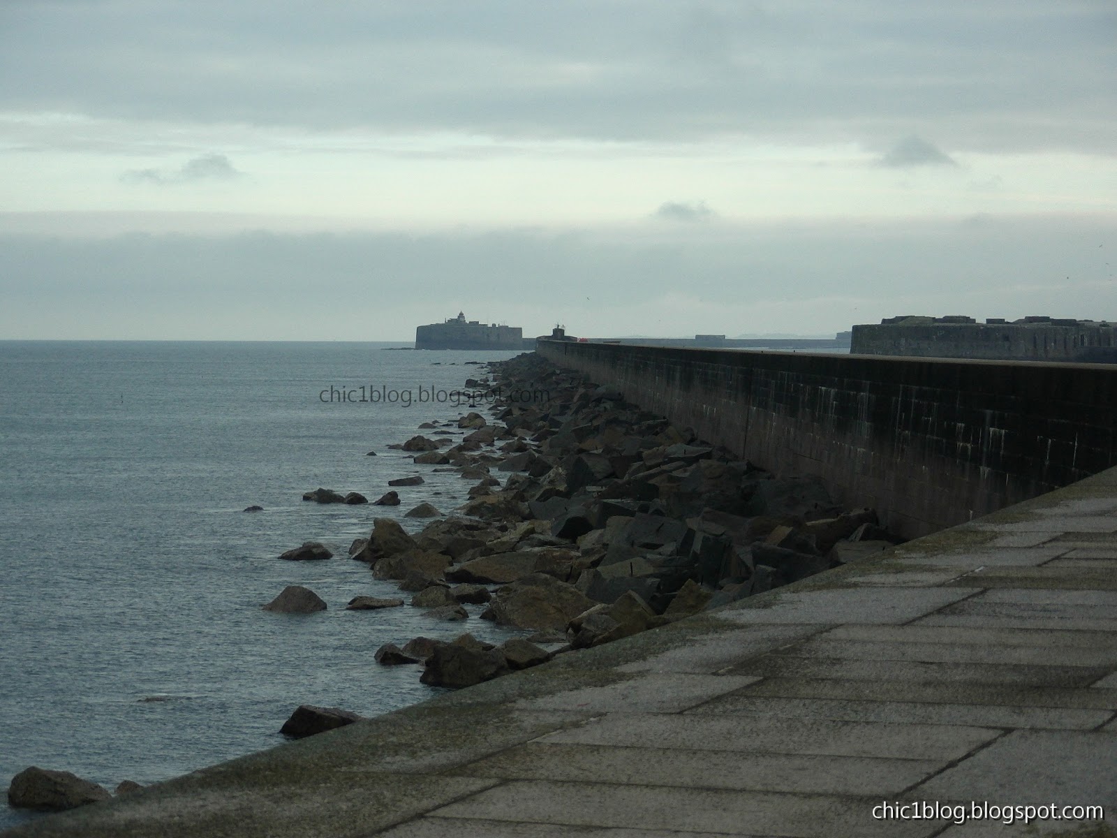 Digue de Querqueville - Vue sur le Fort de l'Ouest (gauche) et sur le Fort de Chavagnac (droite)